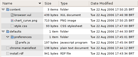 overlay chrome://browser/content/browser.xul chrome://pacote/content/browser.xulAs linhas acima indicam o conteúdo da extensão pacote está no diretório content; possui dois idiomas (pt-BR e en-US) e seus arquivos estão localizados no diretório locale; o arquivo que irá exibir nossa extensão no browser é indicado como overlay.